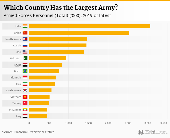 Based on a comparison of 164 countries in 2020, India ranked the highest in armed forces personnel with 3,068 '000 followed by China and Dem. People's Republic of Korea. On the other end of the scale was Seychelles with 0.420 '000, Equatorial Guinea with 1.00 '000 and Luxembourg with 1.00 '000.
