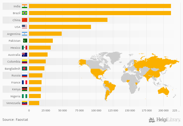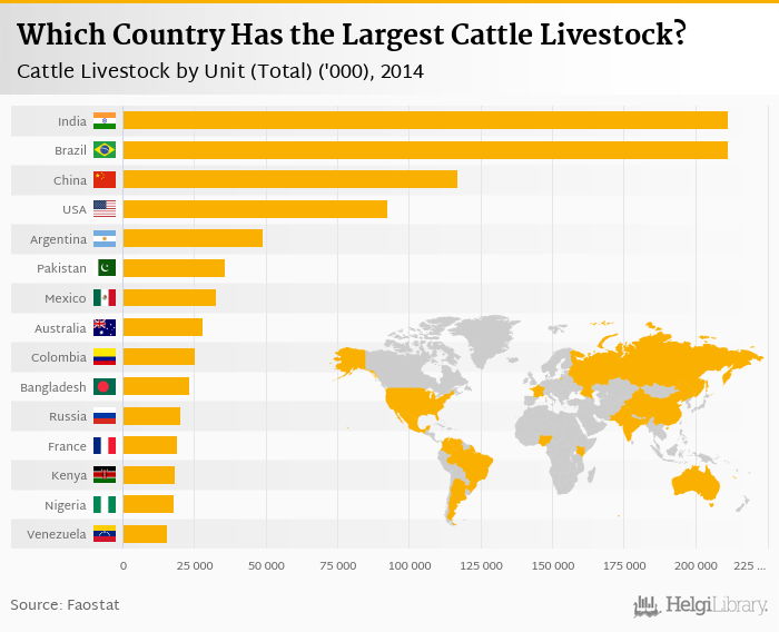 Based on a comparison of 159 countries in 2014, India ranked the highest in cattle livestock with 211,274 '000 followed by Brazil and China. On the other end of the scale was Singapore with 0.200 '000, Seychelles with 0.230 '000 and Brunei with 0.854 '000.