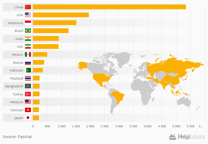 The top ranked country, China, accounted for 25.7 % of chickens livestock in the world. The top 3 countries hold a 42.4 % share while the ten largest countries some 64.4 % in 2014.
