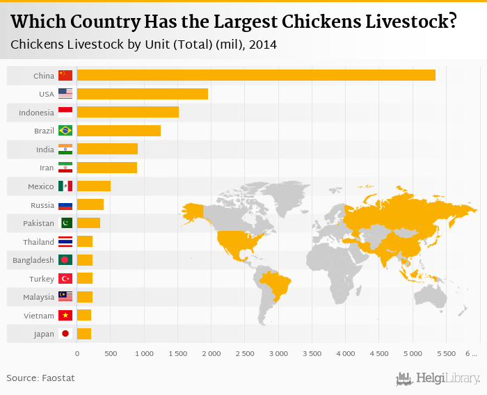 Based on a comparison of 172 countries in 2014, China ranked the highest in chickens livestock with 5,344 mil followed by USA and Indonesia. On the other end of the scale was Cayman Islands with 0.006 mil, Liechtenstein with 0.012 mil and Luxembourg with 0.102 mil.