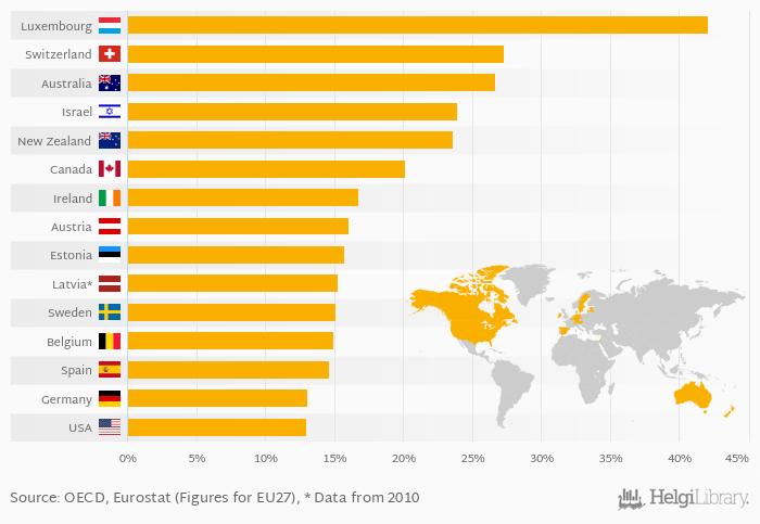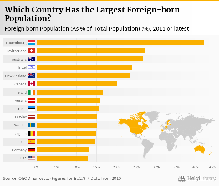 Based on a comparison of 39 countries in 2011, Luxembourg ranked the highest in foreign-born population as a percentage of total population with 42.1% followed by Switzerland and Australia. On the other end of the scale was Indonesia with 0.100%, China with 0.100% and India with 0.400%.