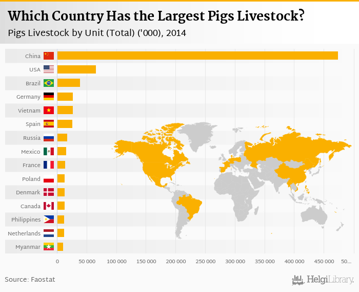 Based on a comparison of 149 countries in 2014, China ranked the highest in pigs livestock with 473,757 '000 followed by USA and Brazil. On the other end of the scale was Tajikistan with 0.546 '000, Cayman Islands with 1.06 '000 and Brunei with 1.15 '000.