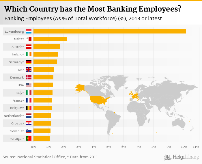 Based on a comparison of 38 countries in 2013, Luxembourg ranked the highest in Banking Employees (As % of Total Workforce) with 10.2% followed by Malta and Austria. On the other end of the scale was Azerbaijan with 0.350%, Thailand with 0.354% and Egypt with 0.381%.