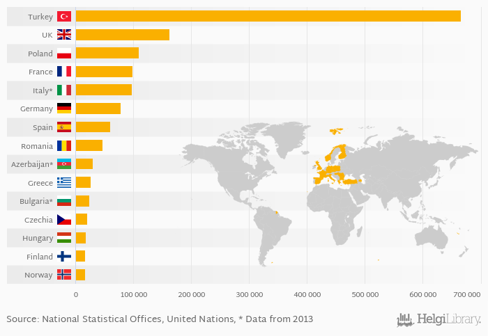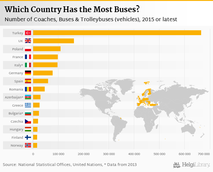 Based on a comparison of 33 countries in 2015, Turkey ranked the highest in number of coaches, buses & trolleybuses with 666,269 vehicles followed by United Kingdom and Poland. On the other end of the scale was Liechtenstein with 103 vehicles, Luxembourg with 1,857 vehicles and Malta with 1,955 vehicles.