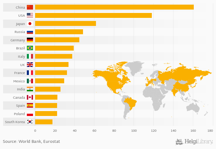 The top ranked country, China, accounted for 14.3 % of number of passenger cars in the world. The top 3 countries hold a 33.7 % share while the ten largest countries some 60.6 % in 2015.