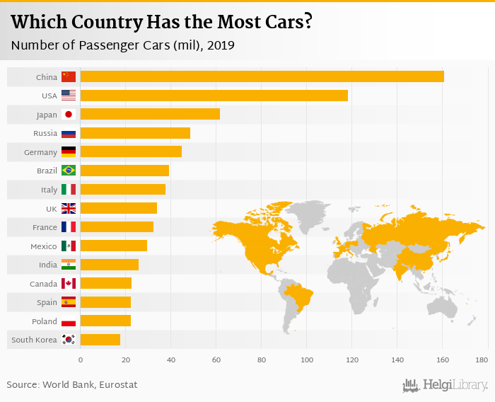 Based on a comparison of 137 countries in 2015, China ranked the highest in number of passenger cars with 136 mil followed by USA and Japan. On the other end of the scale was Mauritania with 0.020 mil, Burundi with 0.020 mil and Liberia with 0.020 mil.