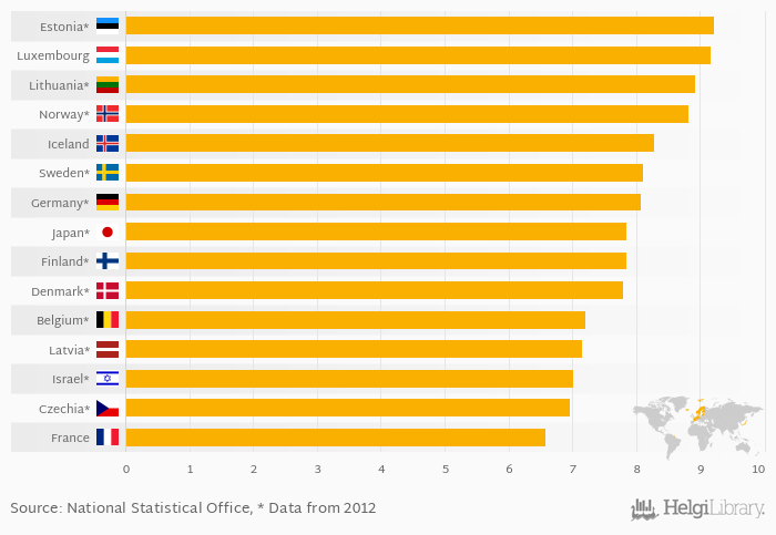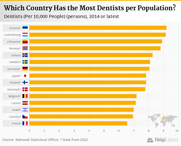 Based on a comparison of 24 countries in 2014, Estonia ranked the highest in dentists per 10,000 inhabitants with 9.22 persons followed by Luxembourg and Lithuania. On the other end of the scale was Mexico with 1.19 persons, Poland with 3.24 persons and South Korea with 4.67 persons.