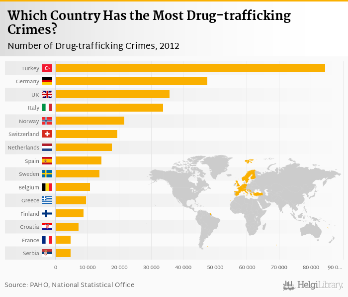 Based on a comparison of 34 countries in 2012, Turkey ranked the highest in number of drug-trafficking crimes with 84,528 followed by Germany and United Kingdom. On the other end of the scale was Iceland with 92.0, Montenegro with 147 and Malta with 203.