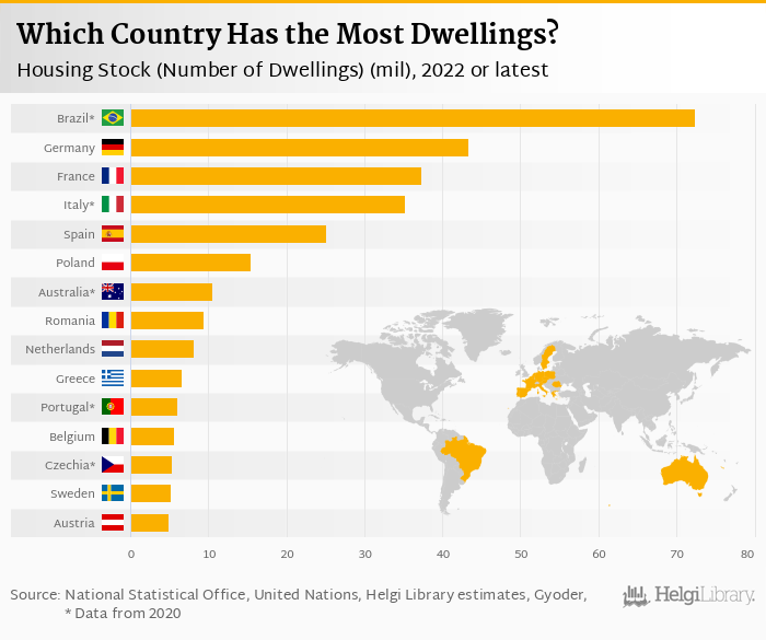 Based on a comparison of 29 countries in 2022, Brazil ranked the highest in housing stock in terms of number of dwellings with 72.4 mil followed by Germany and France. On the other end of the scale was Iceland with 0.155 mil, Luxembourg with 0.244 mil and Cyprus with 0.475 mil.