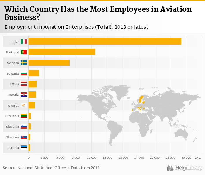 Based on a comparison of 11 countries in 2013, Italy ranked the highest in Employment in Aviation Enterprises (Total) with 24,254 followed by Portugal and Sweden. On the other end of the scale was Estonia with 284, Slovakia with 318 and Slovenia with 375.