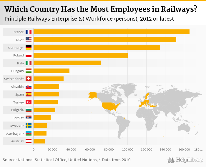 Based on a comparison of 26 countries in 2012, France ranked the highest in principle railways enterprise (s) workforce with 165,928 persons followed by USA and Germany. On the other end of the scale was Estonia with 1,752 persons, Macedonia with 2,582 persons and Ireland with 4,234 persons.