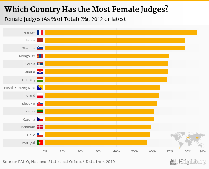 Based on a comparison of 43 countries in 2012, France ranked the highest in female judges as a share of all judges with 85.2% followed by Latvia and Slovenia. On the other end of the scale was Azerbaijan with 11.2%, Japan with 17.7% and Armenia with 21.9%.