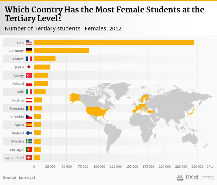 Based on a comparison of 34 countries in 2012, USA ranked the highest in number of tertiary students - females with 244,485 followed by Germany and France. On the other end of the scale was Liechtenstein with 31.0, Malta with 33.0 and Luxembourg with 173.