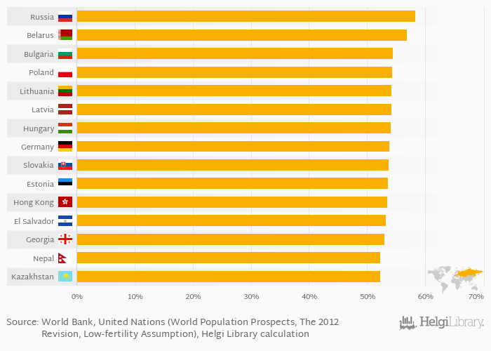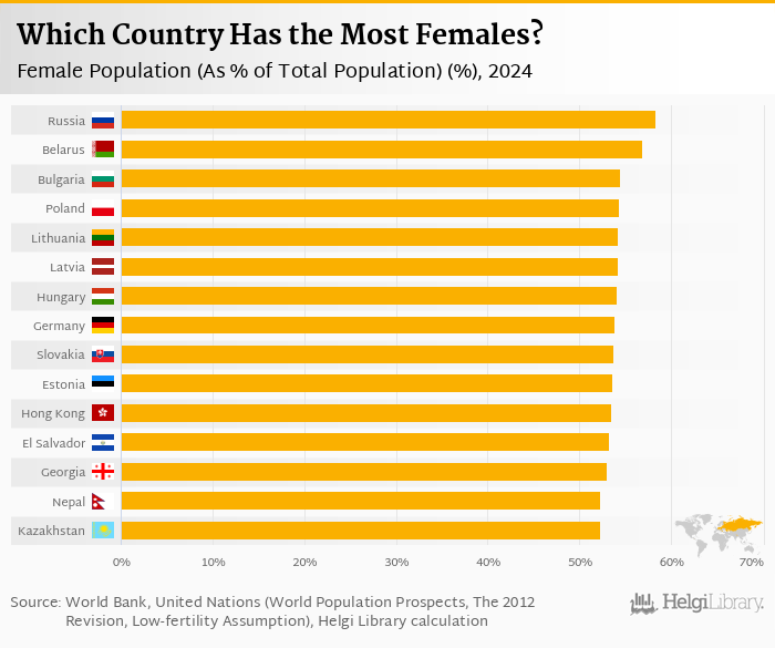 Based on a comparison of 174 countries in 2024, Russia ranked the highest in female population as a percentage of total population with 58.2% followed by Belarus and Bulgaria. On the other end of the scale was Qatar with 24.5%, United Arab Emirates with 31.0% and Oman with 36.1%.