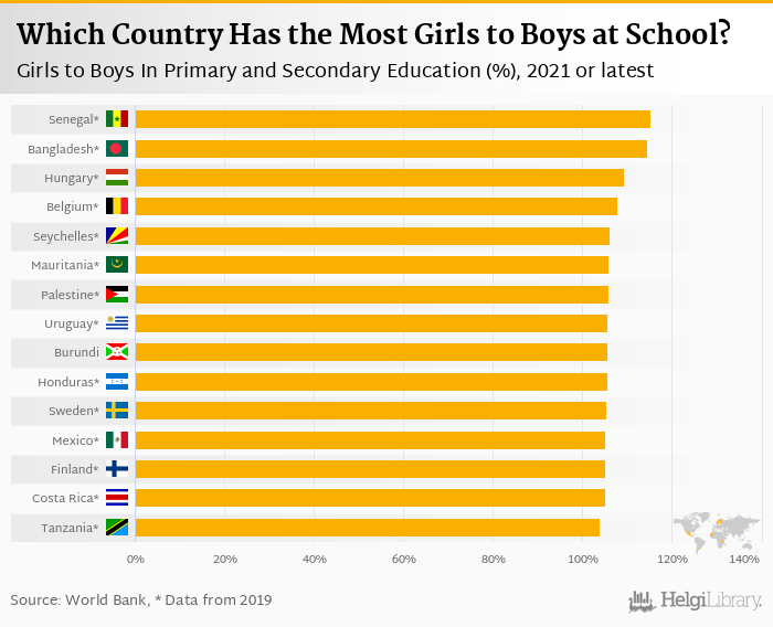 Based on a comparison of 116 countries in 2021, Senegal ranked the highest in girls to boys in primary and secondary education with 115% followed by Bangladesh and Hungary. On the other end of the scale was Chad with 72.8%, Pakistan with 87.7% and Benin with 89.0%.