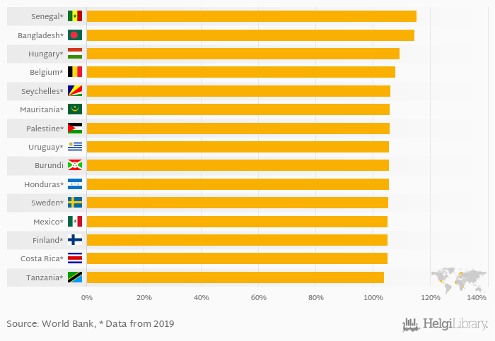 Based on a comparison of 116 countries in 2021, Senegal ranked the highest in girls to boys in primary and secondary education with 115% followed by Bangladesh and Hungary. On the other end of the scale was Chad with 72.8%, Pakistan with 87.7% and Benin with 89.0%.