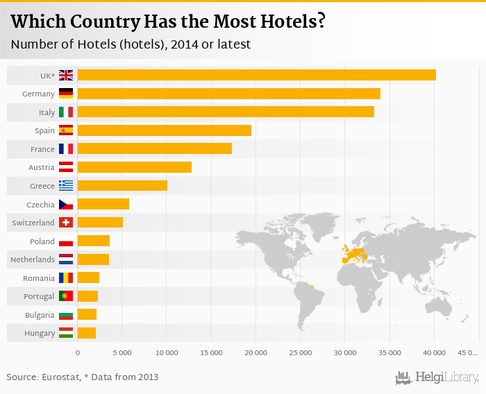 Based on a comparison of 34 countries in 2014, United Kingdom ranked the highest in number of hotels with 40,272 hotels followed by Germany and Italy. On the other end of the scale was Liechtenstein with 40.0 hotels, Malta with 149 hotels and Macedonia with 225 hotels.