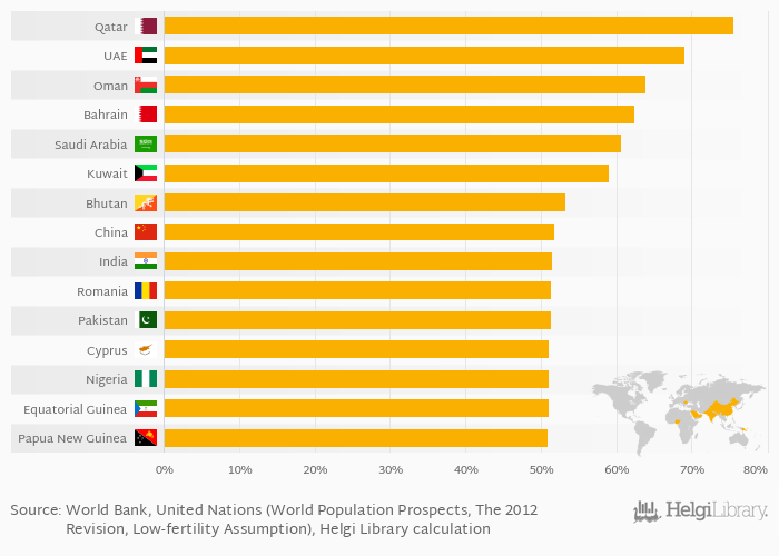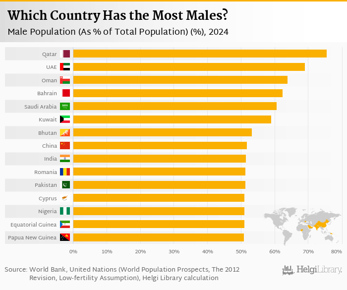 Based on a comparison of 174 countries in 2024, Qatar ranked the highest in male population as a percentage of total population with 75.5% followed by United Arab Emirates and Oman. On the other end of the scale was Russia with 41.8%, Belarus with 43.2% and Bulgaria with 45.6%.