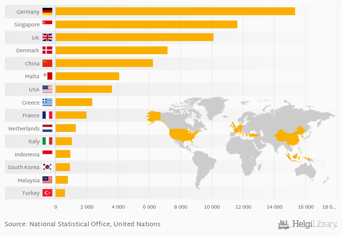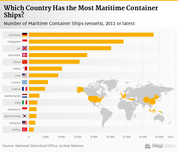 Based on a comparison of 47 countries in 2011, Germany ranked the highest in number of maritime container ships with 15,341 vessels followed by Singapore and United Kingdom. On the other end of the scale was Moldova with 5.64 vessels, Austria with 6.40 vessels and Mongolia with 6.84 vessels.