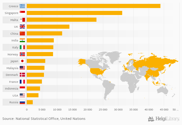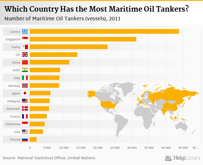 Based on a comparison of 65 countries in 2011, Greece ranked the highest in number of maritime oil tankers with 43,883 vessels followed by Singapore and Malta. On the other end of the scale was Iceland with 0.465 vessels, Lithuania with 1.62 vessels and Kenya with 2.07 vessels.