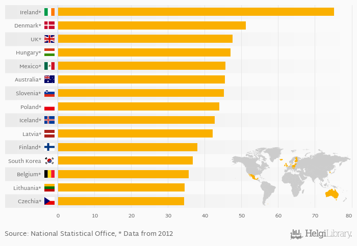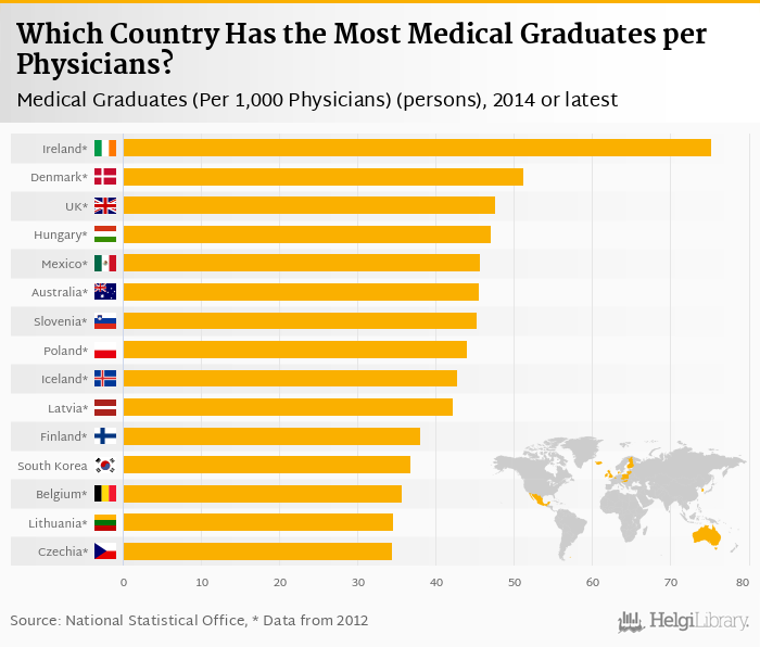 Based on a comparison of 29 countries in 2014, Ireland ranked the highest in medical graduates per 1,000 physicians with 75.3 persons followed by Denmark and United Kingdom. On the other end of the scale was Israel with 14.7 persons, Switzerland with 24.1 persons and Japan with 25.7 persons.