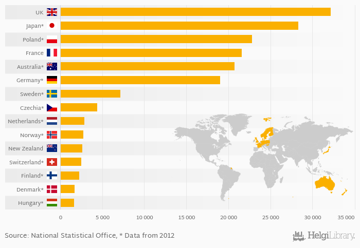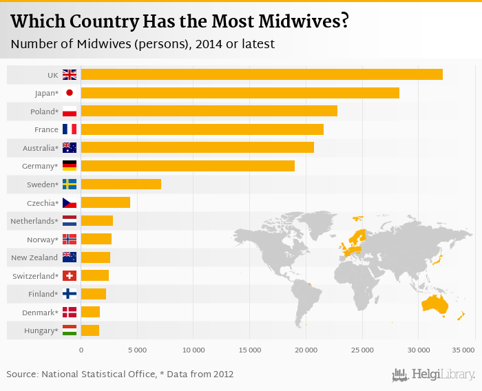 Based on a comparison of 23 countries in 2014, United Kingdom ranked the highest in number of midwives with 32,215 persons followed by Japan and Poland. On the other end of the scale was Slovenia with 124 persons, Luxembourg with 195 persons and Iceland with 270 persons.