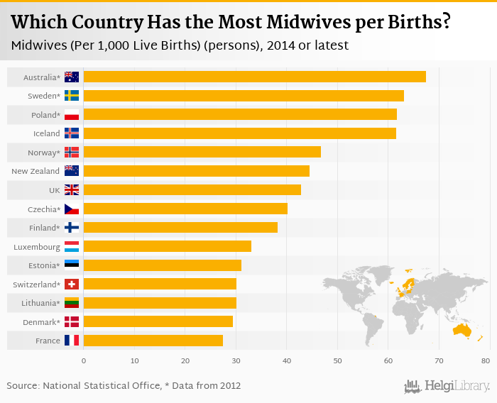 Based on a comparison of 23 countries in 2014, Australia ranked the highest in midwives per 1,000 live births with 67.6 persons followed by Sweden and Poland. On the other end of the scale was South Korea with 2.53 persons, Slovenia with 5.87 persons and Netherlands with 16.3 persons.