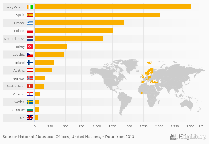 | Ivory Coast | '000 | ... | ... | ... | ... | ... | ... | ... | ... | ... | ... | ... | ... | ... | ... | ... | 2,550 | 2,170 | 2,100 | 2,256 | ... | |