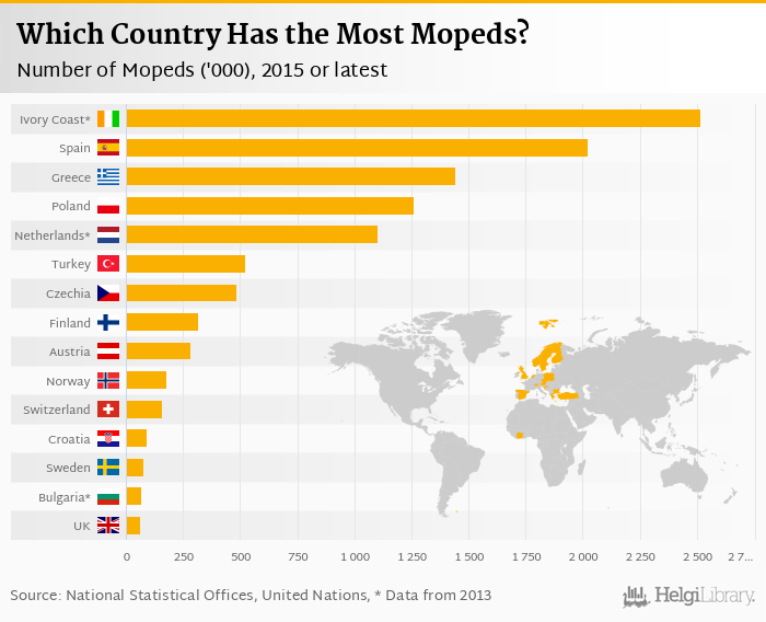 Based on a comparison of 25 countries in 2015, Ivory Coast ranked the highest in number of mopeds with 2,517 '000 followed by Spain and Greece. On the other end of the scale was Liechtenstein with 1.11 '000, Ireland with 2.02 '000 and Romania with 7.00 '000.
