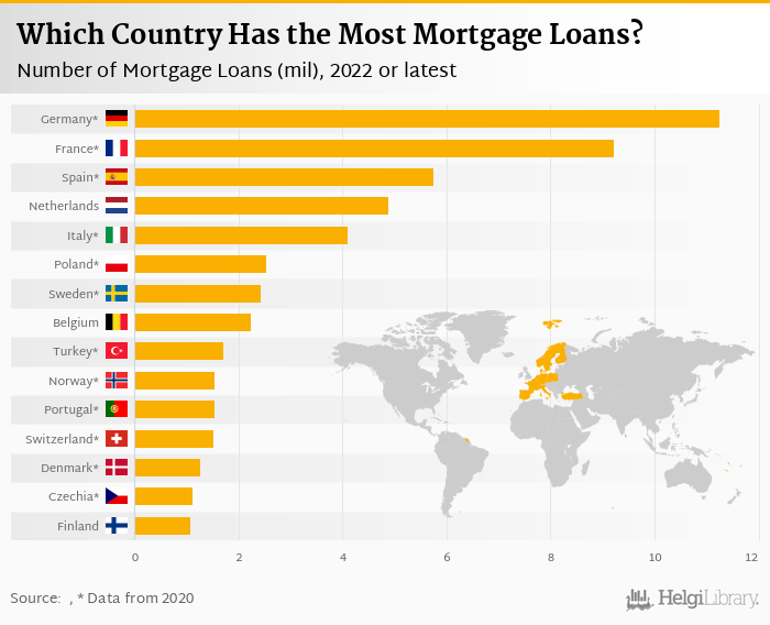 Based on a comparison of 33 countries in 2022, Germany ranked the highest in number of mortgage loans with 11.3 mil followed by France and Spain. On the other end of the scale was Montenegro with 0.003 mil, Macedonia with 0.004 mil and Albania with 0.007 mil.