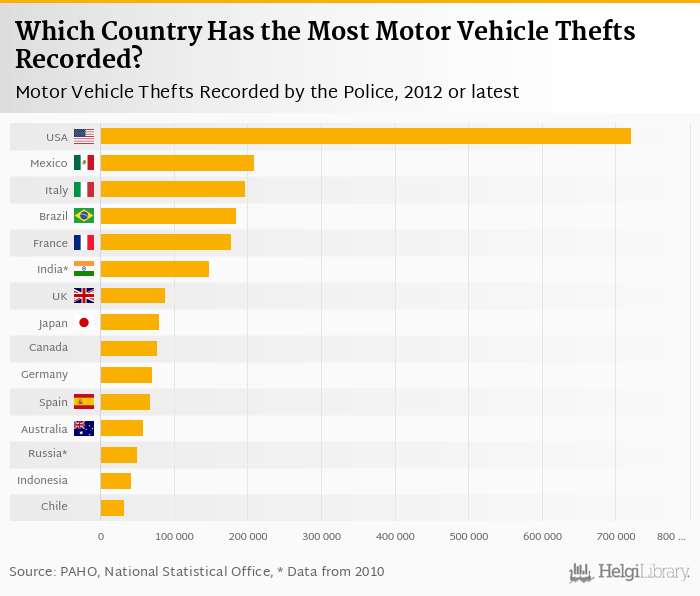 Based on a comparison of 66 countries in 2012, USA ranked the highest in motor vehicle thefts recorded by the police with 721,053 followed by Mexico and Italy. On the other end of the scale was Montenegro with 43.0, Tajikistan with 48.0 and Azerbaijan with 60.0.