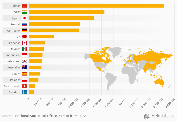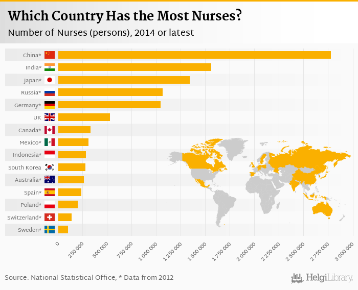 Based on a comparison of 32 countries in 2014, China ranked the highest in number of nurses with 2,783,121 persons followed by India and Japan. On the other end of the scale was Iceland with 5,018 persons, Luxembourg with 6,657 persons and Estonia with 8,134 persons.
