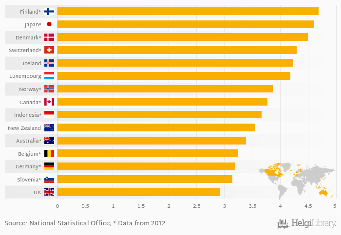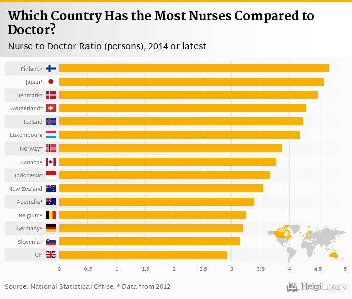 Based on a comparison of 32 countries in 2014, Finland ranked the highest in nurse to doctor ratio with 4.70 persons followed by Japan and Denmark. On the other end of the scale was Colombia with 0.593 persons, Mexico with 1.21 persons and China with 1.22 persons.
