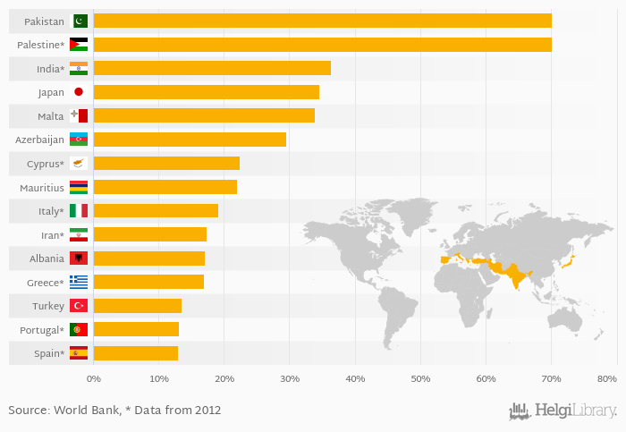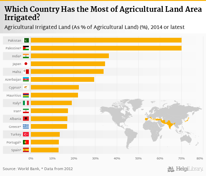 Based on a comparison of 57 countries in 2014, Pakistan ranked the highest in agricultural irrigated land as a share of agricultural land with 70.2% followed by Palestine and India. On the other end of the scale was Botswana with 0.004%, Estonia with 0.031% and Lesotho with 0.048%.
