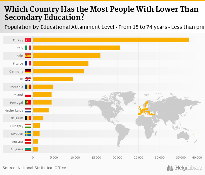 Based on a comparison of 32 countries in 2016, Turkey ranked the highest in Population by Educational Attainment Level - From 15 to 74 years - Less than primary, primary and lower secondary education (levels 0-2) - Total with 37,054 '000 followed by Italy and Spain. On the other end of the scale was Iceland with 70.6 '000, Luxembourg with 112 '000 and Estonia with 173 '000.