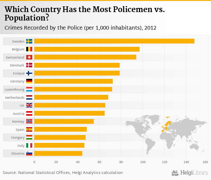 Based on a comparison of 32 countries in 2012, Sweden ranked the highest in crimes recorded by the police per 1,000 people with 148 followed by Belgium and Switzerland. On the other end of the scale was Montenegro with 9.41, Serbia with 10.1 and Romania with 14.2.