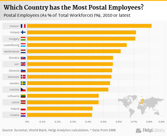 Based on a comparison of 26 countries in 2010, France ranked the highest in Postal Employees (As % of Total Workforce) with 0.815% followed by Finland and Hungary. On the other end of the scale was Bulgaria with < 0.001%, Austria with < 0.001% and Belgium with < 0.001%.