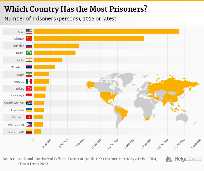 Based on a comparison of 168 countries in 2015, USA ranked the highest in number of prisoners with 2,173,800 persons followed by China and Russia. On the other end of the scale was Monaco with 34.0 persons, Liechtenstein with 53.0 persons and Guinea Bissau with 92.0 persons.