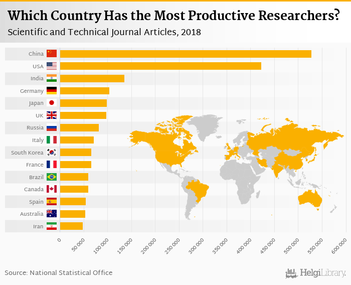 Based on a comparison of 175 countries in 2018, China ranked the highest in scientific and technical journal articles with 528,263 followed by USA and India. On the other end of the scale was Equatorial Guinea with 2.60, Comoros with 3.28 and Turkmenistan with 3.69.