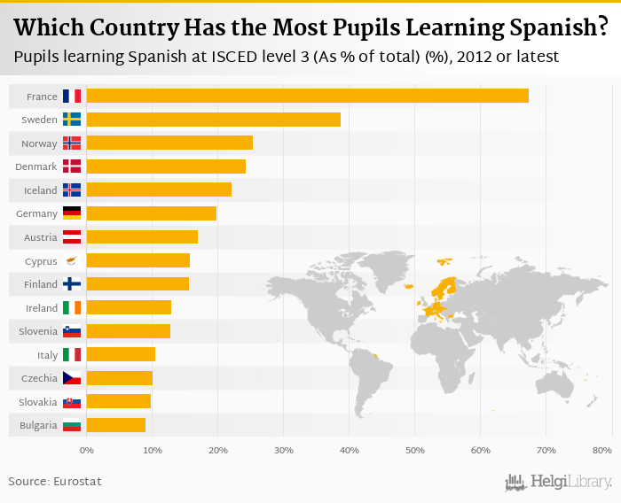 Based on a comparison of 27 countries in 2012, France ranked the highest in pupils learning spanish at isced level 3 as a percentage of total with 67.5% followed by Sweden and Norway. On the other end of the scale was Latvia with 0.500%, Lithuania with 0.600% and Romania with 2.20%.