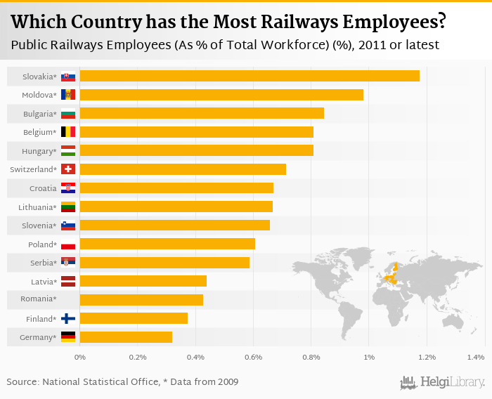 Based on a comparison of 28 countries in 2011, Slovakia ranked the highest in Public Railways Employees (As % of Total Workforce) with 1.18% followed by Moldova and Bulgaria. On the other end of the scale was Spain with 0.089%, USA with 0.096% and Turkey with 0.102%.