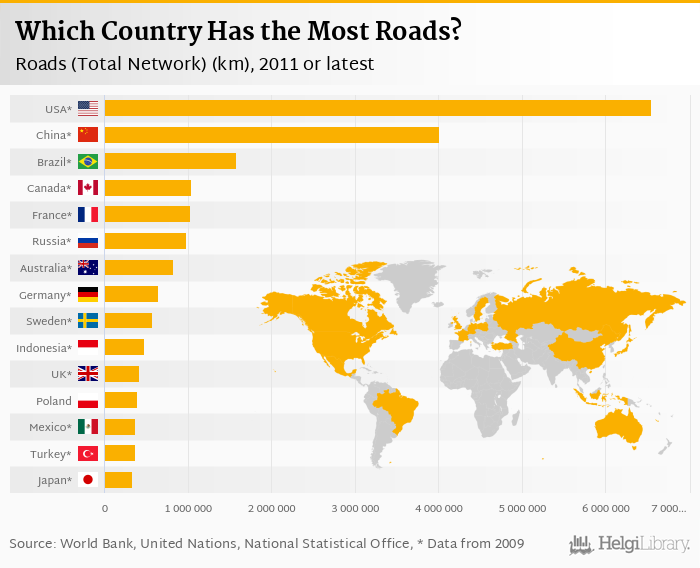 Based on a comparison of 62 countries in 2011, USA ranked the highest in road network with 6,545,326 km followed by China and Brazil. On the other end of the scale was Luxembourg with 2,880 km, Singapore with 3,377 km and Armenia with 7,705 km.