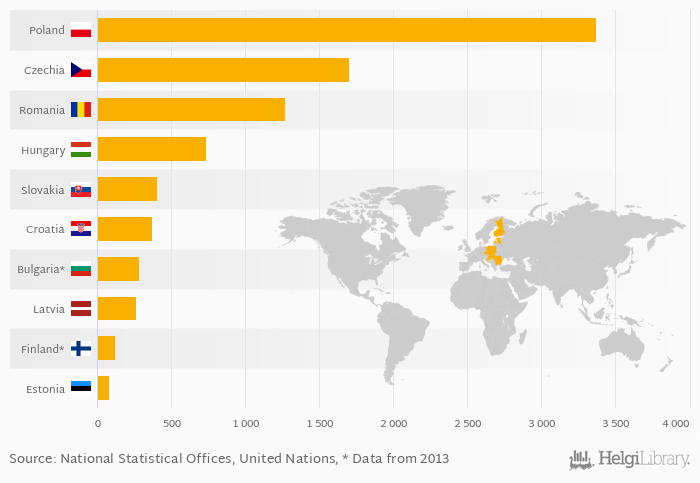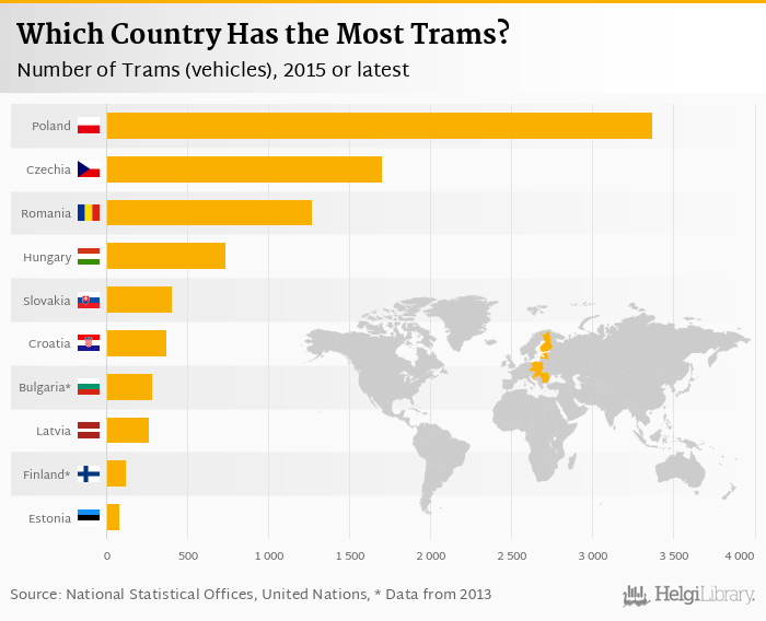 Based on a comparison of 10 countries in 2015, Poland ranked the highest in number of trams with 3,373 vehicles followed by Czech Republic and Romania. On the other end of the scale was Estonia with 78.0 vehicles, Finland with 125 vehicles and Latvia with 266 vehicles.
