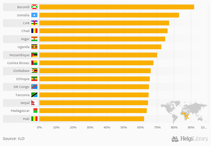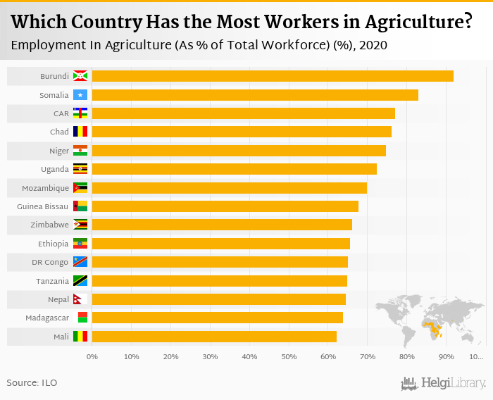 Based on a comparison of 173 countries in 2020, Burundi ranked the highest in Employment In Agriculture (As % of Total Workforce) with 92.0% followed by Somalia and Central African Republic. On the other end of the scale was Argentina with 0.087%, Hong Kong with 0.167% and Macao with 0.367%.