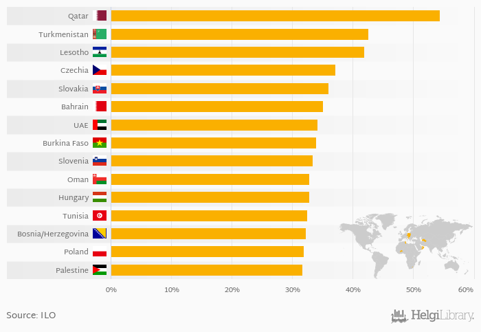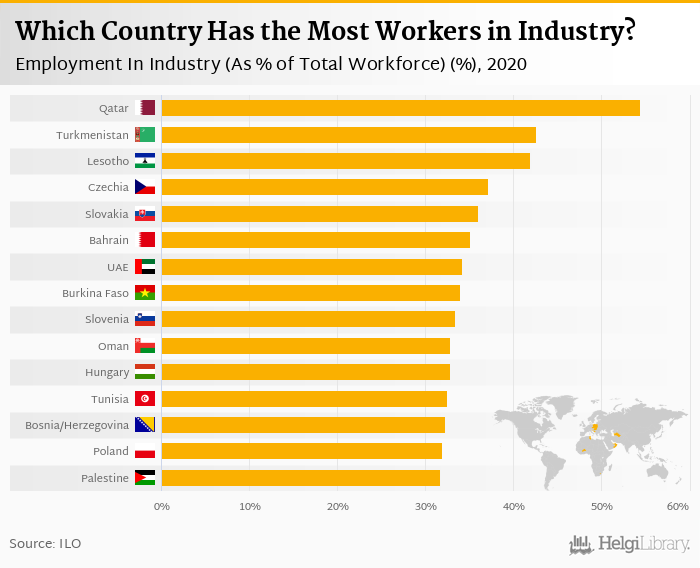 Based on a comparison of 173 countries in 2020, Qatar ranked the highest in Employment In Industry (As % of Total Workforce) with 54.4% followed by Turkmenistan and Lesotho. On the other end of the scale was Burundi with 1.43%, Chad with 2.10% and Somalia with 3.55%.