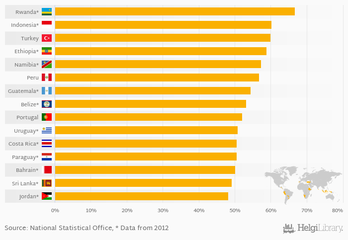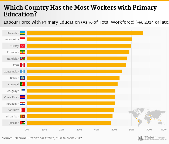 Based on a comparison of 82 countries in 2014, Rwanda ranked the highest in Labour Force with Primary Education (As % of Total Workforce) with 66.7% followed by Indonesia and Turkey. On the other end of the scale was Ukraine with 0.100%, USA with 1.80% and Russia with 4.10%.