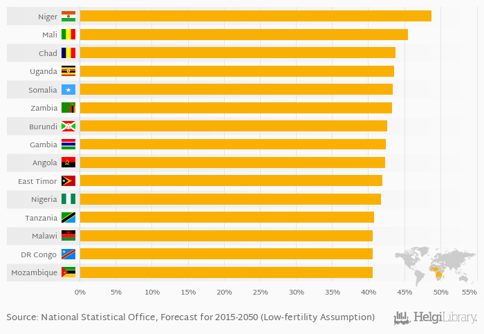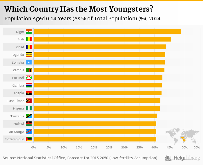 Based on a comparison of 174 countries in 2024, Niger ranked the highest in population aged 0-14 years as a percentage of total population with 48.7% followed by Mali and Chad. On the other end of the scale was Portugal with 9.71%, Hong Kong with 9.84% and Japan with 9.86%.
