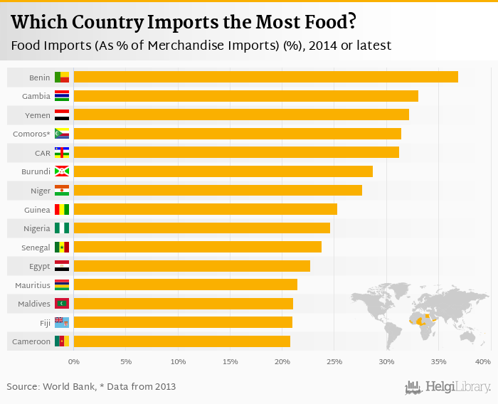 Based on a comparison of 144 countries in 2014, Benin ranked the highest in food as a share of merchandise imports with 36.9% followed by Gambia and Yemen. On the other end of the scale was Argentina with 2.46%, Singapore with 3.34% and India with 3.97%.