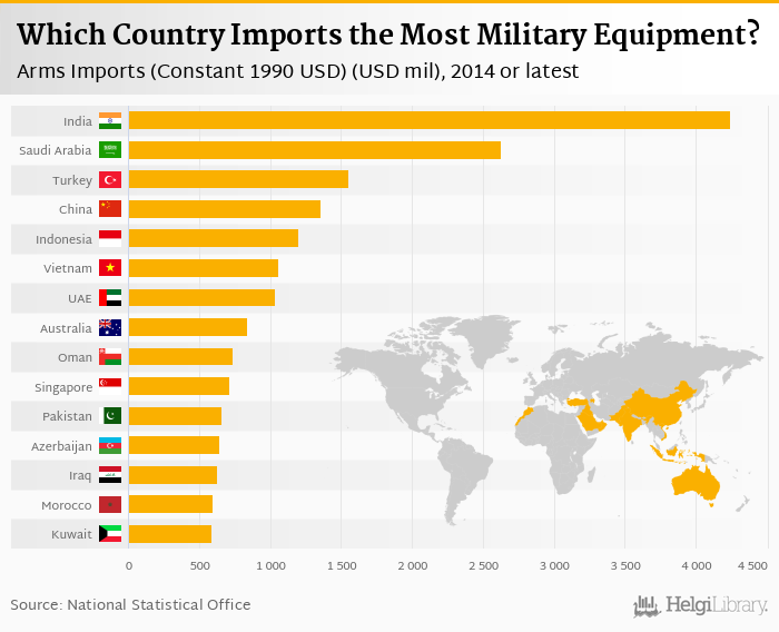 Based on a comparison of 142 countries in 2014, India ranked the highest in arms imports at constant USD prices from 1990 with USD 4,243 mil followed by Saudi Arabia and Turkey. On the other end of the scale was Kosovo with USD 1.00 mil, Macedonia with USD 1.00 mil and Luxembourg with USD 1.00 mil.
