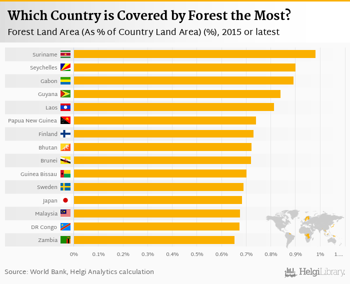 Based on a comparison of 170 countries in 2015, Suriname ranked the highest in forest land area as a share of country land area with 0.983% followed by Seychelles and Gabon. On the other end of the scale was Oman with < 0.001%, Egypt with < 0.001% and Libya with 0.001%.